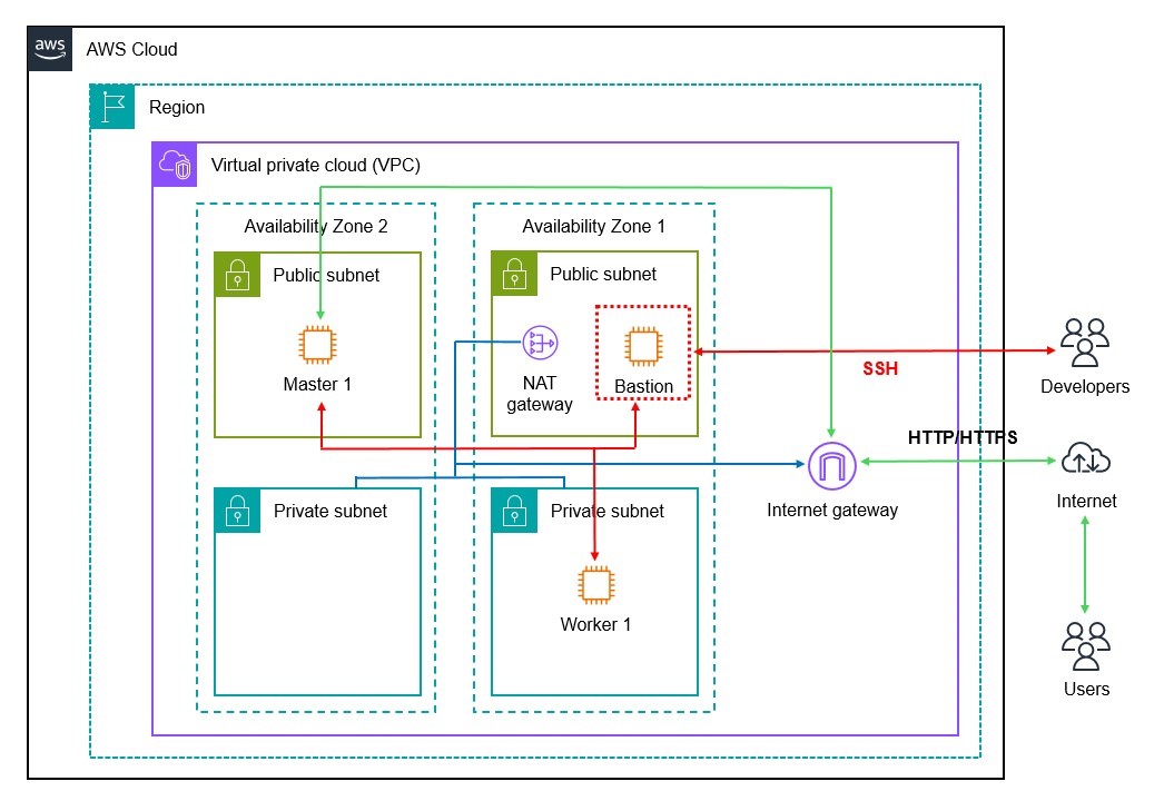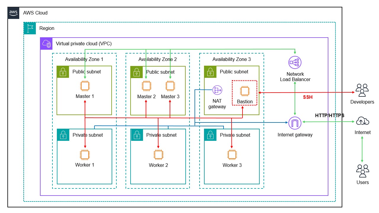 - 사용자들은 Network Load Balancer > Master Node (Ingress) > Worker Node > Pod로 서비스를 받는다.