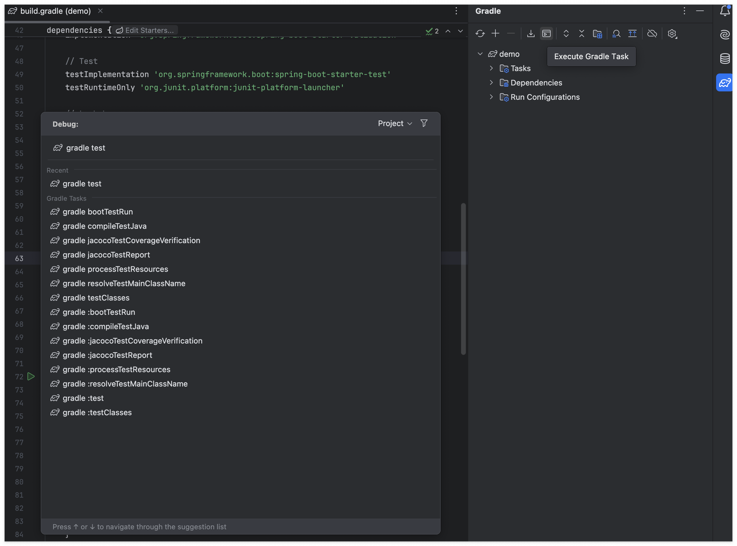 build.gradle 작성 후 > 오른쪽 Gradle > Execute Gradle Task > gradle test